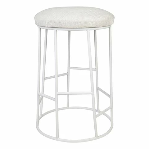 Natural upholstered kitchen stool with detailed cross design white steel legs.
