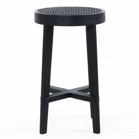Oak frame kitchen stool painted black with cross bar and rattan seat.