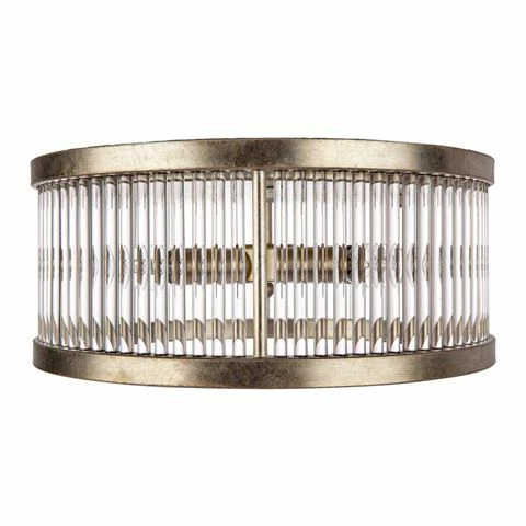 Inspired by Art Deco grandeur, the enchanting Francine flush mount features an elegant antique silver finished metal frame paired with a mesmerising display of cylindrical glass rods to create a stylish drum shade that enlivens the interior space with its gentle glamour. A modern classic design, the Francine flush mount creates a single, chic statement that would work well on low ceilings, in bedrooms or centred above a dining space.