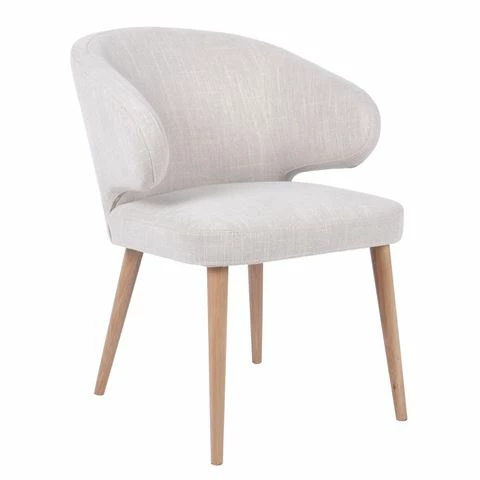 Natural linen upholstered dining chair with wing style arms and natural oak timber legs.
