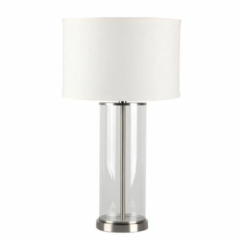 - Features a brass finish metal rod encased in a clear glass cylinder base
