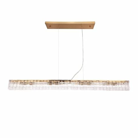 Celebrating an organic aesthetic, cast glass blocks are weightlessly suspended on an elegant brushed brass finish iron frame, creating a mood of understated luxury. Inspired by modern architecture, the Soprano linear pendant radiates a gorgeous ambient light that will transform the look and feel of your space. Perfect for dining areas, the Soprano pendant suits contemporary living and combines timeless quality with individuality.