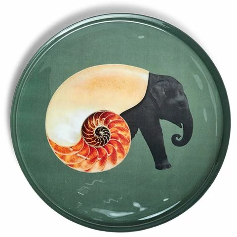 The Shellephant Round Tray by Gangzai is handmade in iron with clear enamel on the interior, making it a piece to enjoy forever as a tray or for anything your heart desires.