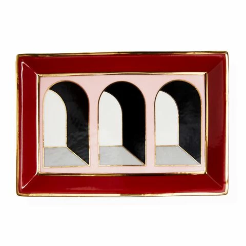 Inspired by the curves of the Colosseum, the Arcade Rectangle Tray is crafted from high fired porcelain with shiny gold accents. A bold design that elevates your tablescape. Patterned to perfection.