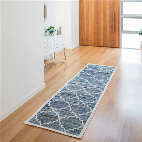 Revamp your home décor with the coastal vibes of the Leela Rug from Sugar Sugar. Handwoven from reclaimed textiles from clothing offcuts, this decorative rug is printed with a classic symmetrical lattice pattern that’s enhanced by the different washes of denim used, creating an entrancing blend of deep blue hues.