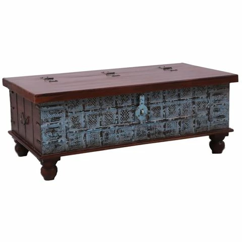 Introducing a versatile piece of furniture which is a storage trunk and also a sleek coffee table. Designed in the traditional style, it has a storage area with a hinged lid, a latch on the front and two handles on the side. The arrangement makes its movement easy. With a dark walnut finish and featuring a dynamic wood grain design, it looks so beautiful amid any interior decor setting.You may decorate it in your living area and use it as a table to keep beverage cups, devices, laptops, or even a board game. The blue painted distressed finish on the hand-crafted metal sheet of the table front adds to its antique look. The storage coffee table is made of sustainably harvested solid Mangowood with metal work on it. The wood and metalwork provide it with a robust structure and good looks. Short, scalloped legs provide the storage chest with strong support. The fully assembled storage trunk cum coffee table comes with a one-year warranty.